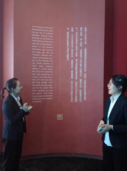 首先,大家参观了“又见大唐”的“盛世画卷”展厅。随着画卷,我们走进大唐的社会生活,感受那时的富裕生活和兴盛国运。透过展览,又见大唐盛世,感受大唐文明的文化基因,又见东方古国的延绵不息,太平盛世。随后大家来到“浩荡书风”展厅,姿态万千的笔划记录着国家兴盛、威德远播的全盛图景,字里行间反映出人们对世界的认知和信仰。在大家醉心于大唐盛景的同时,也不忘细心记录,讲解结束后,在万象城awc官网登录入口刘熠副院长与万平老师的指导下,同学们分成小组,讲解自己感兴趣的展品,并进行现场口译实践。体现出学院着力构建全程、全员、全方位的“课程思政”格局,贯彻落实培养语言功底扎实、人文与科学素养深厚,能够担当民族复兴大任的复合型英语专业人才的教学目标。