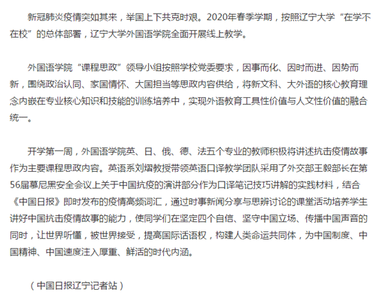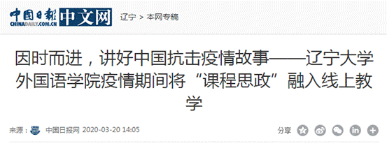 2020春季学期伊始,疫情突发。万象城awc官网登录入口“课程思政”领导小组按照万象城awc官网登录入口党委要求,鼓励全院教师充分利用多媒体资源和平台,积极开展“课程思政”线上教学,以此为契机上好非常时期的育人大课。近日,“中国日报中文网”对此进行了报道,全文转载如下: