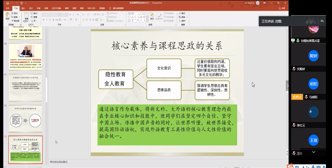 本次工作坊分别邀请了俄语系顾宏哲、英语系唐明及学院院长刘熠3位老师进行了课程思政经验分享。